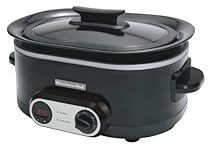New KitchenAid Slow Cooker offers unparalled food safety and convenience. Programmable electronic timer with 5 cooking settings provide users with the flexibility to Keep Warm, Simmer or cook on Low, High or Auto settings. Cooker switch automatically to Keep Warm mode after program timer expires. LED lights provide a 3 Digit display with countdown cook timer for easy to program functions. 400 Watts of power and electronic temperature sensor deliver accurate temperature setting and a rapid warm up of food for safety. Ob-round, ergonomic flared rim ceramic insert helps capture condensation while providing an elegant look and solid grip area. Quart markings on interior of cooking insert easily measure food servings. Glass lid with silicone soft seal to maintain moisture during cooking and prevent edge chipping. Ergonomic cool-touch handle assures a confident grip.